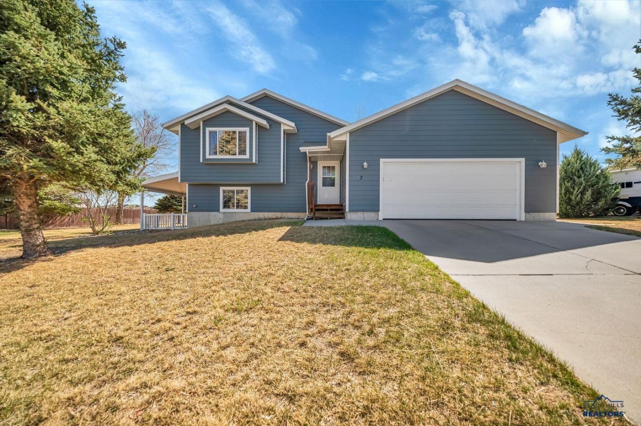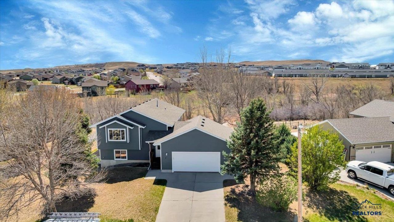 Listed by Ashley Handcock, REMAX Advantage 605.393.5867. Well-maintained 4 bed, 3 bath split-foyer home in Rapid City's Plum Creek subdivision! The main level features a vaulted living room that flows into an open kitchen with breakfast bar, stainless appliances, and adjoining dining area. The primary suite offers a walk-in closet and private ensuite bath, along with an additional bedroom and full bath on the main level. The walkout lower level offers a large family room with gas fireplace and additional space for recreation or hobbies, along with two bedrooms, a full bath, and laundry area. Enjoy a 38x12 covered patio and upper deck overlooking a spacious yard with mature trees, underground sprinklers, and a storage shed. Attached heated 2-car garage, new Class 4 roof and siding in 2024, all conveniently located near Elks Golf Course with easy access to the Hwy and local shopping and dining. Schedule your showing today!